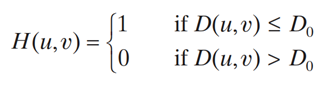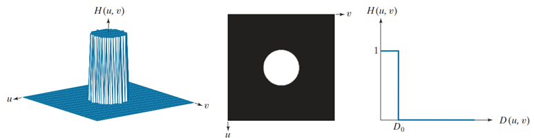 ILPF는 가장 단순한 lowpass filter로, 주파수가 원점으로부터 특정 거리(D0)이상이면 0으로 깔아버리는 필터이다.