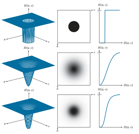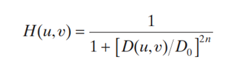BLPF는 GLPF처럼 매끄러운 연속함수를 필터로 하지만, 아래와 같은 함수를 사용한다.
