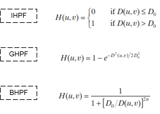 선명화 처리를 위해서는, 이미지 전반적으로 들어가 있는 저주파 영역을 줄이고 선명하고 자세한 부분을 표현하는 고주파 영역을 살려야 한다. 이를 위한 필터는 Highpass filter라고 한다. Highpass filter는 lowpass filter와 마찬가지로 3가지이며, 만드는 방법은 아주 간단하다.