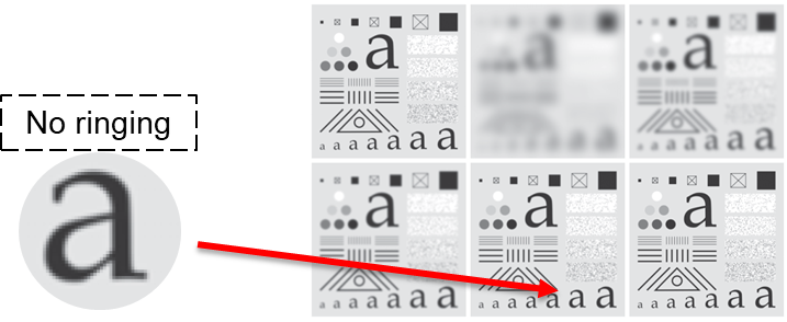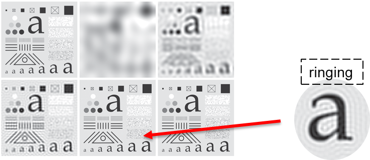 세 가지 종류 중 같은 D0를 사용했을 때 blurring이 가장 극단적으로 나타난다. 그러나, 극단적인 색깔 변화로 인해 사물 주위로 물결 모양으로 얼룩이 생기는 ringing 현상이 나타난다.