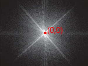 이미지 전체의 공간주파수 분포를 나타낸 것이 아래와 같은 주파수 영역이다. 가운에 원점에 해당하는 점은 가로/세로 방향 주파수가 모두 0인 점으로, 이미지 전체의 평균 intensity를 나타낸다. 이를 DC term(직류성분)이라고 부른다. 또한, 원점에서 가까울수록 저주파, 멀어질수록 고주파를 나타낸다.