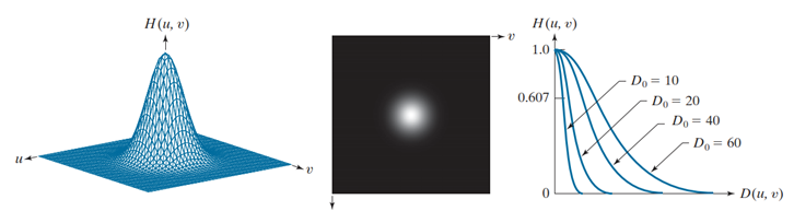 GLPF는 원점을 평균으로 하는 정규분포 형태의 분포이다. 여기서 D0값은 표준편차로 설정한다.