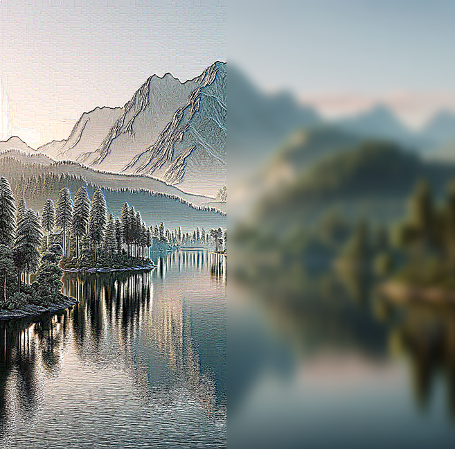 위와 같이 DALL.E로 생성한 원본 이미지에 대해, 아래 그림은 오른쪽 절반에는 블러 처리, 왼쪽 절반에는 선명화 처리를 한 것이다.