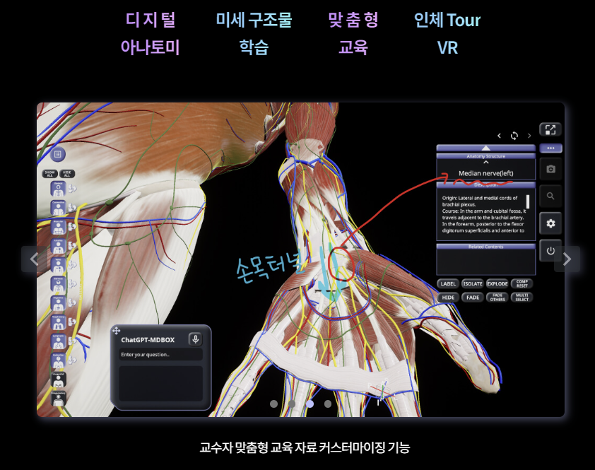 메디컬아이피는 AR 기반으로 수술 시뮬레이션을 제공하는 회사이다. 환자 중심의 AI 및 가상현실 기술을 바탕으로, 아래와 같이 해부학 교육용 자료 제작, 각종 Computer Vision 솔루션 제공을 하고 있다. 또한 이를 이용하여 질병의 발병 확률을 예측하는 제품이 FDA 승인을 받았다.