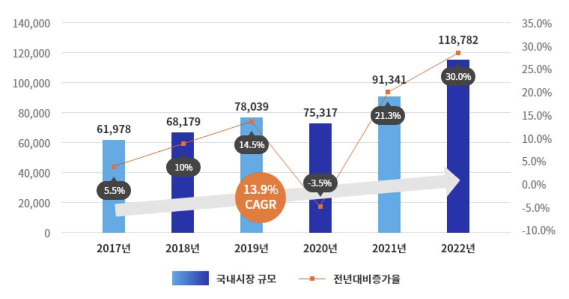 먼저 한국 의료기기 시장의 전반적인 동향에 대해 알아보자. COVID-19를 감안하고서라도, 2017년부터 2022년까지 의료기기 시장은 CAGR 13.9%의 빠른 속도로 성장했다. 2022년 시장 규모는 약 11.87조 원이었다.