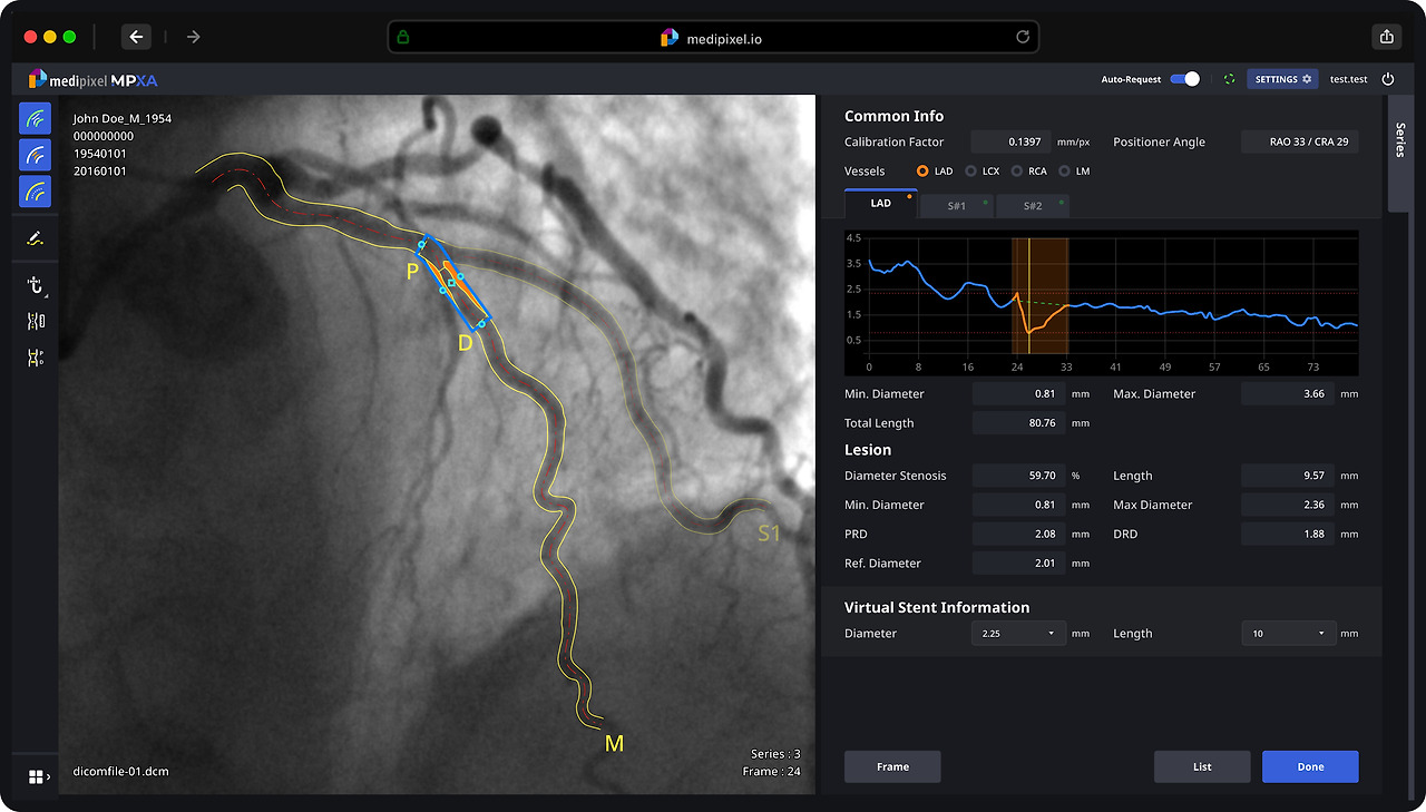 메디픽셀은 "심혈관" 에 집중한 AI 솔루션을 개발하는 회사이다. 심혈관 중재술 (Intervention)에 사용 가능한 이 솔루션은, Angio 영상을 보고 실시간으로 혈관의 협착 상태를 분석해 주는 소프트웨어이다. 또한, 병변에 맞는 스텐트 추천, 프레임 추천 등 기존 중재술 워크플로우를 대부분 자동화하여 재현하였다.