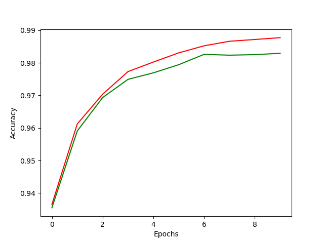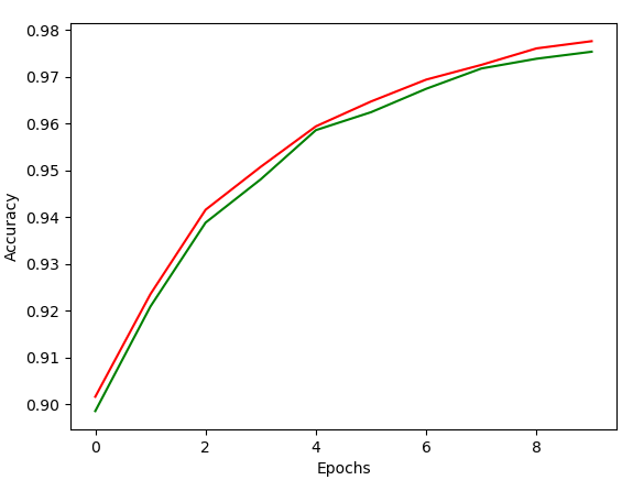 pyplot에 의해 나온 training과 validation 결과이다. 초록색이 validation 결과이며, 빨간색이 training 결과이다. Classifier Accuracy는 97.48점으로 꽤 높은 점수로 나왔다.