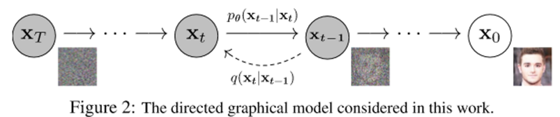 원본 이미지 x0에 노이즈를 한 단계씩 추가하여 완전한 noise 이미지로 바뀐 것을 xt라고 하자. DDPM은 아래와 같이 두 과정으로 진행된다.
