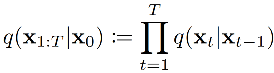 분포 q는 hidden markov chain이기 때문에, q(x_t | x_0)은 연속한 두 q를 아래와 같이 곱하여 계산할 수 있다.