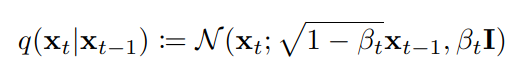 t-1번째 이미지에서 t번째 이미지로 노이즈를 추가하는 과정 q는 아래와 같다. beta값은 variance scheduler이다. beta = 1이라면 x_t-1 항이 사라지기 때문에 t번째 이미지가 오직 noise에 의해서만 표현될 것이다. 반면, beta = 0이라면 노이즈가 포함되지 않을 것이다.