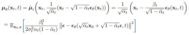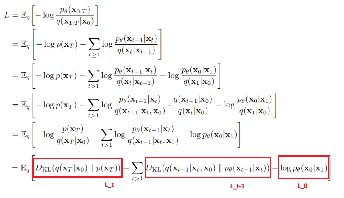 위의 objective function인 L에는 세 개의 항, L_t, L_t-1, L_0이 들어간다. 먼저, L_t의 경우 forward process에서는 beta 값이 학습되지 않고 상수로 고정하기 때문에, L_t 자체를 상수취급해도 된다. 둘째로, L_t-1의 경우 아래와 같은 과정을 거친다.