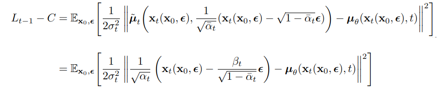 이를 이용하면, p(x_t-1 | x_t)를 추정한 것이 되므로 x_t를 이용하여 x_t-1을 sampling 할 수 있게 되는 것이다. 이들을 잘 조합하여 L_t-1을 아래와 같이 계산할 수 있다. 마찬가지로 자세한 증명이 궁금하다면 논문을 참고하길 바란다.
