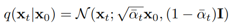 이 L값은 "수학적 귀납법"의 원리와 같이, x_t로 x_t-1을 예측할 수 있다면 x_0도 예측할 수 있다는 원리를 가진다. 이 식으로 KL Divergence를 통해 forward process의 posterior ( q(xt|x0) 등)을 reverse process와 직접 비교할 수 있게 되기 때문에, L을 objective function이라고 부른다. 이때 q는 gaussian noise를 통해 아래와 같이 표현 가능하다. alpha는 1-beta를 바꾼 것뿐이다.