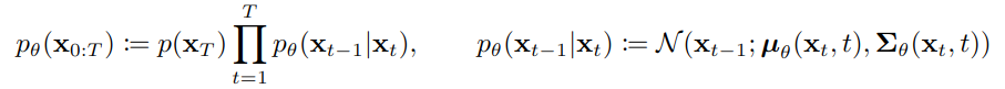 우리가 원하는 분포 p (노이즈-> 이미지)를 이 q를 이용하여 추정할 것이다. 즉, p는 x_t에서 시작하여 x_0까지 이어지는 chain으로 나타낼 수 있으며, 아래 수식의 오른쪽 부분의 mu (평균)과 sigma(표준편차)가 우리가 추정해야 할 값들이다.