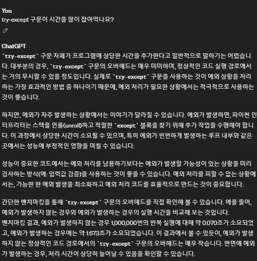 위와 같이 실행한 결과 시간 초과가 걸렸다. Chat GPT에게 물어보니, try-except 구문은 예외가 많이 발생할 경우 시간을 많이 잡아먹을 수 있다고 한다.