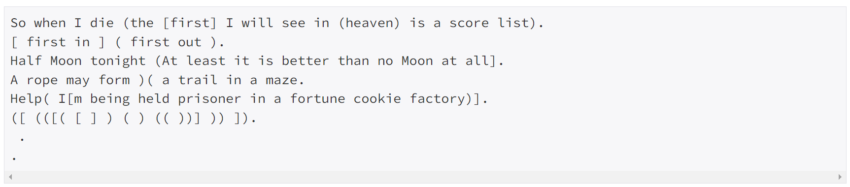 왼쪽 괄호와 오른쪽 괄호의 균형을 맞추어 세계의 균형을 유지해 보자.네네 9012번 괄호 문제와 유사하지만, 소괄호 대괄호로 구분되어 있는 것이 다르다. 그리고 문자열이 괄호만 주어지는 것이 아니라 아래와 같이 알파벳과 공백 등도 섞여 있다. 가장 아랫줄에 보이는 마침표만 있는 것도 균형잡힌 문자열이다.
