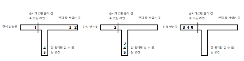 하지만, 이렇게 할 경우 좁은 공간 스택이 중간에 비워지는 케이스에서 예외가 난다. 예를 들어, n=5일 때 3 2 1 4 5가 들어오면 3과 2가 좁은 공간으로 들어가고 1이 간식을 받은 후 2와 3이 간식을 받고 4와 5가 받을 수 있다. 이를 해결하기 위해, 간식을 받는 사람은 무조건 1, 2, 3... 순서로 받아야 함에 착안하기로 했다.
