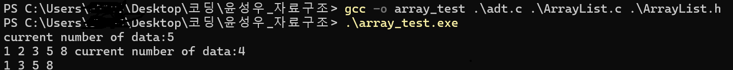 헤더파일 "ArrayList.h" 는 윤성우의 열혈자료구조 블로그(https://blog.naver.com/oedu/223011150597)에서 다운로드 받을 수 있다. 작성한 코드와 ArrayList.h, ArrayList.c를 포함하여 3개를 한꺼번에 컴파일하고 실행하면 아래와 같이 출력된다.
