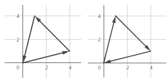 선분은 서로 다른 두 점으로 정의된다. 유향선분은 방향을 가지는 선분으로, 두 개의 점을 시작과 끝으로 구분해 주기만 하면 된다. 시작점의 위치를 고려하지 않는 벡터와는 조금 다른 개념이지만, 유향선분을 벡터로 생각하여 내적을 정의할 수 있다. 본 구현에서는 아래 6개의 유향선분을 리스트에 저장할 것이다.
