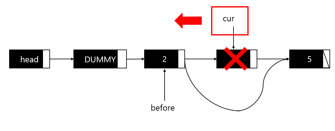 이러한 상황에서 before가 중요한데, 앞선 포스팅(https://cascade.tistory.com/72)의 delNode와 마찬가지로 삭제되는 노드 앞의 노드의 주소를 저장하는 역할을 하여 cur이 효율적으로 이를 전달받을 수 있도록 한다. 이는 코드로 아래와 같이 구현되었다.