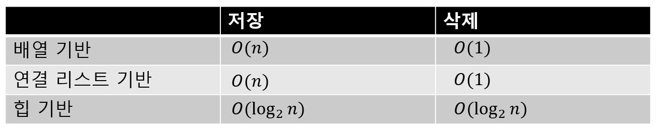 이러한 세 가지 구현(배열, 연결 리스트, 힙)에서 삽입과 삭제의 시간 복잡도를 비교하면 아래와 같다.