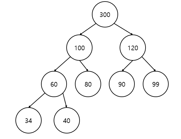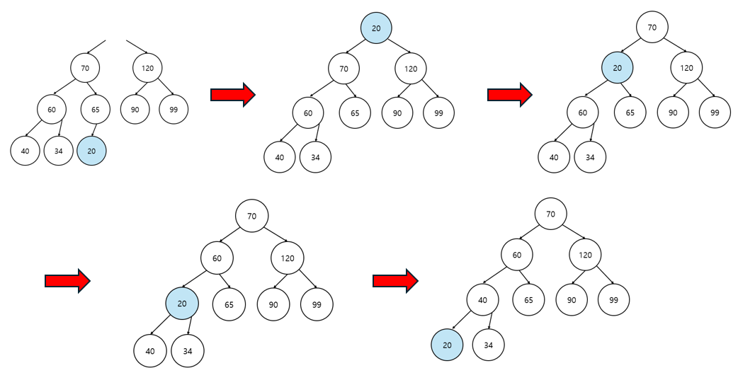 300을 삭제하면, 마지막 terminal node 중 하나인 "20"을 루트 자리에 올리고, 자식 노드와 비교를 하고 우선순위에 따라 바꿔치기를 하면서 제 위치를 찾아가도록 하는 것이다.