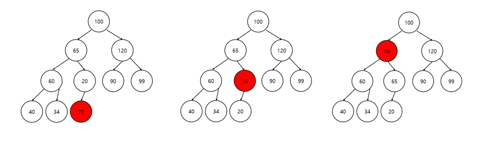 위 그림의 힙에 새로운 데이터 70을 저장한다고 하자. 이때 전략은, 먼저 마지막 위치에 새로운 데이터를 저장하고, 부모 노드와 우선순위를 비교하여 위치가 바뀌어야 한다면 바꾸는 것을 반복하는 것이다.