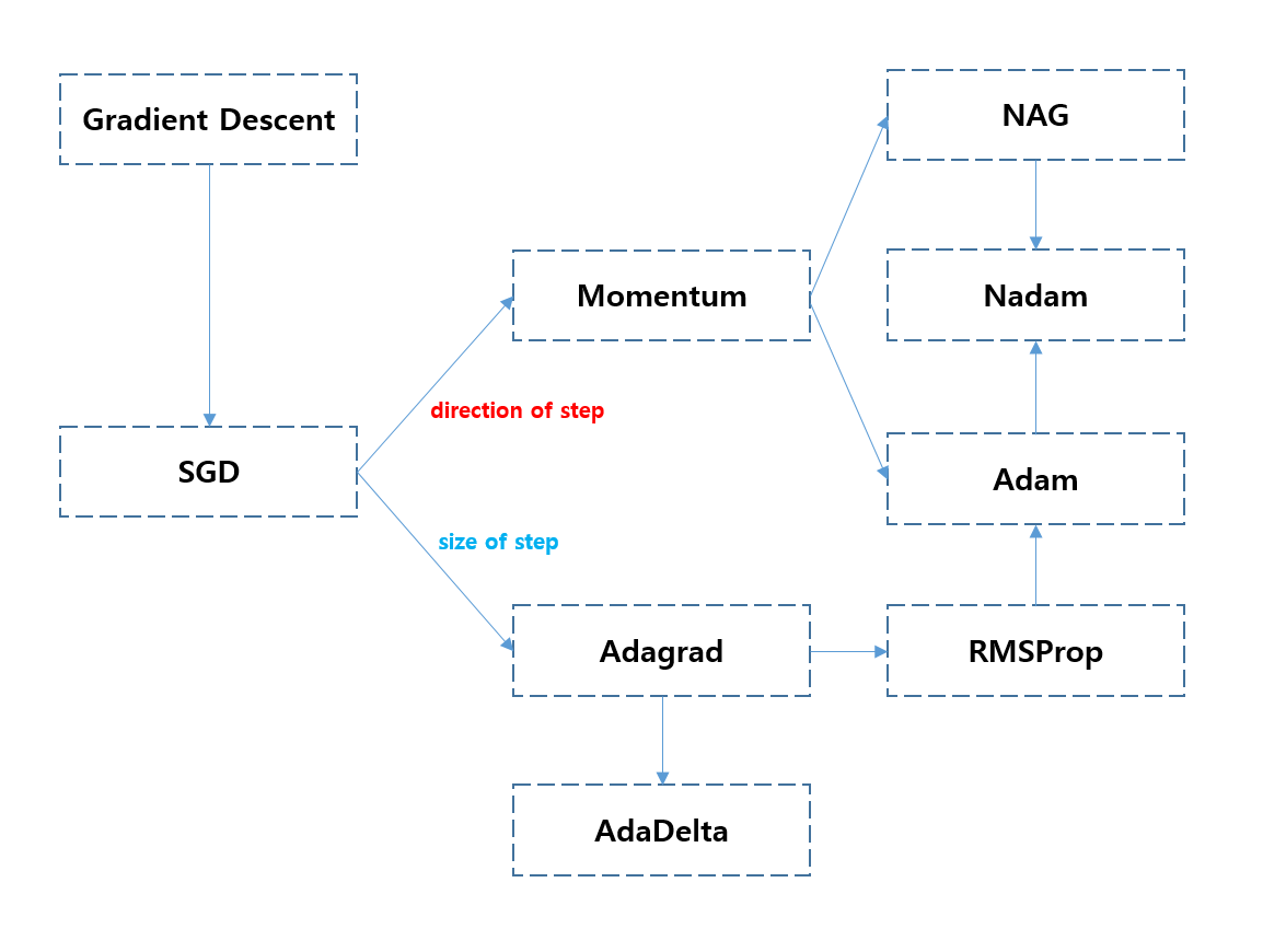 옵티마이저 알고리즘은 Gradient Descent에서 파생되어, 아래와 같은 종류가 있다.