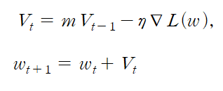Momentum 에서는 아래와 같이 관성의 개념을 적용하였다. 다음 Step이 momentum에 의한 항과 gradient에 의한 항의 벡터합으로 표현되는 것이다. 즉, 가중치가 업데이트되는 정도가 gradient에만 의존하는 것이 아니라, 이전의 상태에도 의존한다. 이렇게 되면 gradient가 0인 곳에서도 학습이 가능하며 학습 속도를 SGD보다 빠르게 할 수 있다.