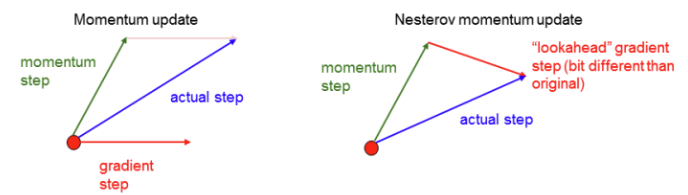 NAG는 Momentum 방식의 업그레이드 버전이다. gradient step을 "lookahead" gradient 로 바꾼 것인데, 이는 Momentum 방식이 관성에 의해 global minimum을 지나치는 것을 방지한다. 즉, step 이전의 gradient를 업데이트에 이용하는 것이 아니라, 이동 후의 gradient를 예상해 사용하는 것이다.