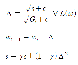 AdaDelta와 RMSprop은 위에서 언급한 Adagrad의 단점을 보완하기 위해 만들어졌다. 과거의 모든 gradient를 누적하는 Adagrad와 달리, AdaDelta는 최근의 gradient에 더 큰 가중치를 주기 위해, 최근 gradient를 제곱하여 누적시킨다.