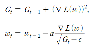 기존의 optimizer들은 모델의 파라미터 전체를 한 번에 업데이트했다. 이는 개별 파라미터를 한 번에 움직여야 하는데, Adagrad는 변화량이 컸던 파라미터는 변화량을 줄이고, 변화량이 작았던 파라미터는 변화량을 늘리는 방식을 사용한다. 단점은 global minimum에 도달하지 않은 채 변화량이 너무 적어져 학습이 매우 느려질 수 있다는 것이다.