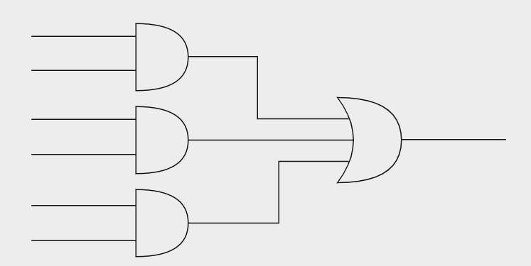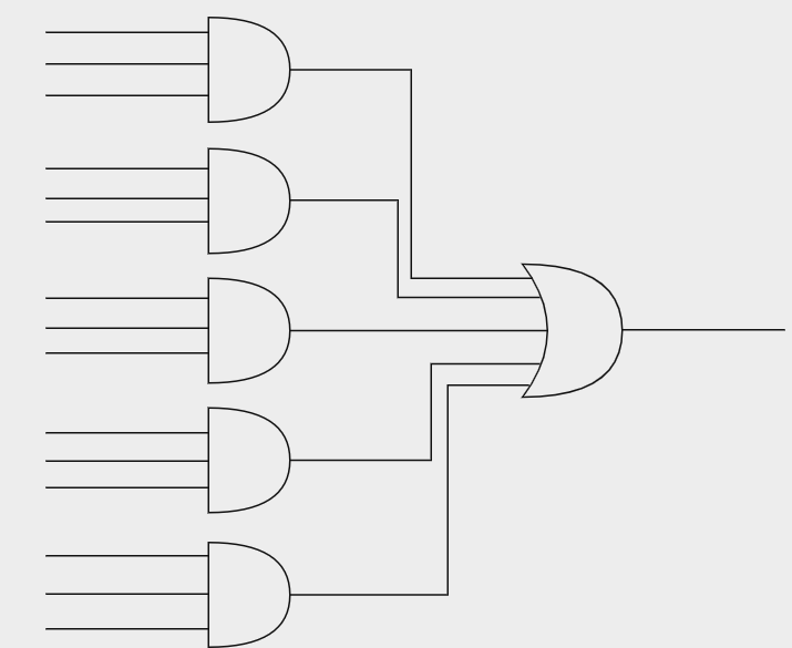 이는 SOP 형태로 적혀 있으므로, 아래와 같이 회로를 구성하는 것을 생각할 수 있다. 이러한 회로를 2-level 회로라고 하는데, 입력부터 출력까지 통과해야 하는 게이트가 최소 2개이기 때문이다.