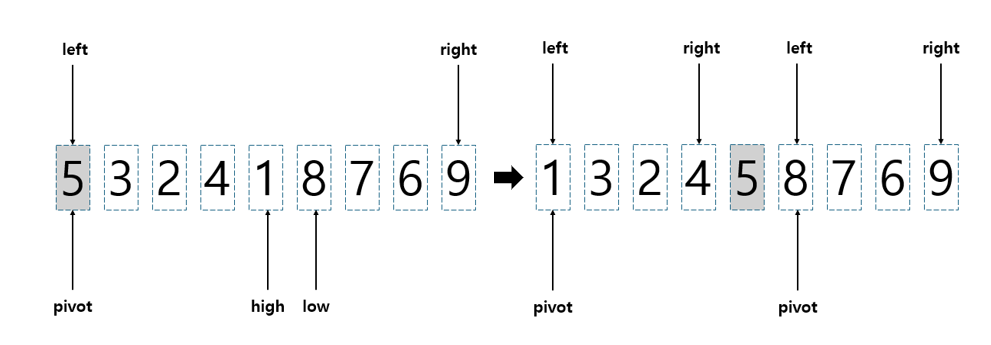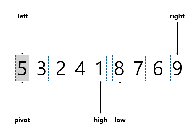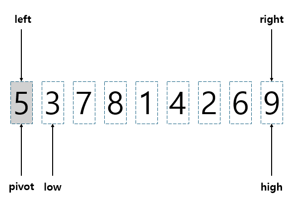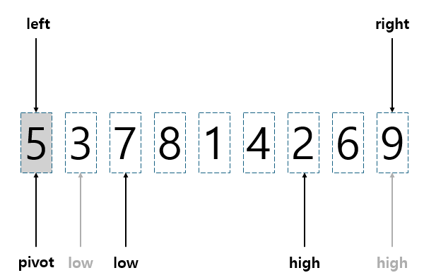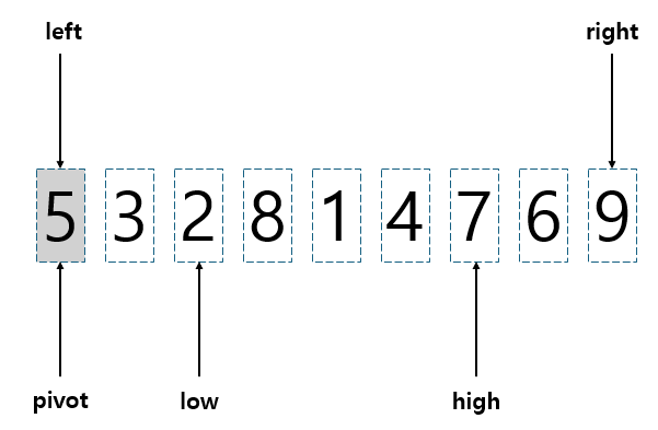 - high: pivot을 제외하고 가장 오른쪽에 위치한 칸