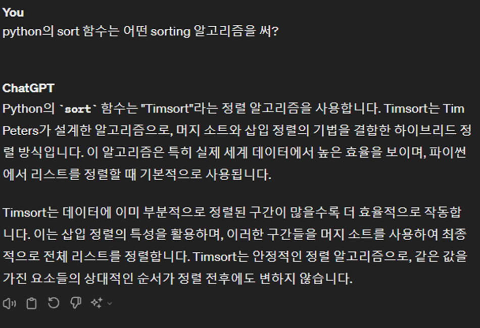 10장 정렬을 모두 공부하고 나니, python의 내장 함수로 있는 sort() 메소드나 sorted() 함수는 어떤 정렬 방식을 쓸지 궁금해졌다. ChatGPT에 물어본 결과, "Timsort" 라고 하는, 본 교재에서 다루지 않은 알고리즘을 쓴다고 하는데, 배운 것 중에서는 병합 정렬과 비슷하다고 한다.