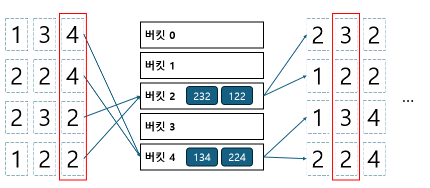 기수란, 데이터를 구성하는 기본 요소로, 십진수의 경우 0~9의 숫자를 말하며, 영단어의 경우 아스키 코드가 될 수 있다. 예를 들어, 134, 224, 232, 122를 마지막 자리를 기준으로 정렬한다고 할 때, 모든 수가 0~5안에 있으므로, 다섯 개의 버킷을 잡고 아래와 같이 정렬할 수 있다. 또한, 첫 자리나 두 번째 자리를 기준으로 정렬한다고 해도, 같은 버킷 집합을 사용할 수 있다.