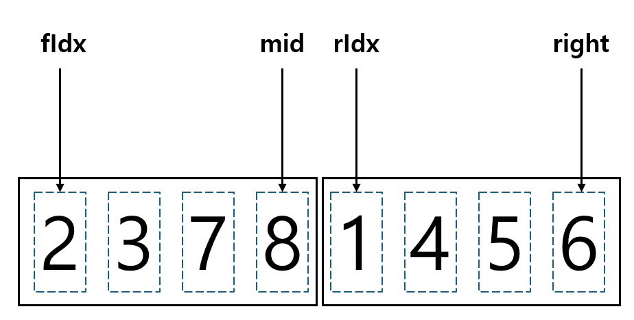 여기서 fIdx는 첫 번째 배열의 첫 번째 위치, rIdx는 두 번째 배열의 첫 번째 위치를 나타내는데, while문의 반복조건 fIdx<=mid && rIdx<=right는 두 배열 모두 남은 데이터가 있음을 의미한다. 그림으로 나타내면 아래와 같은데, 첫 번째와 두 번째 배열에서 하나씩 sortArr로 옮겨질 때마다 fIdx 혹은 rIdx가 오른쪽으로 한 칸씩 옮겨지는 것이다.