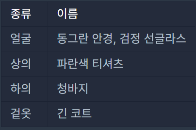 예를 들어 코니가 가진 옷이 아래와 같고, 오늘 코니가 동그란 안경, 긴 코트, 파란색 티셔츠를 입었다면 다음날은 청바지를 추가로 입거나 동그란 안경 대신 검정 선글라스를 착용하거나 해야합니다.