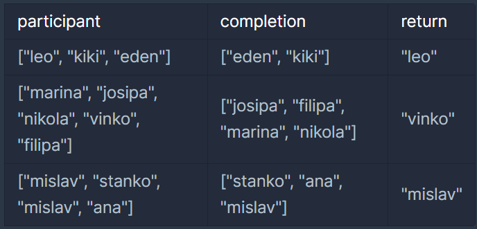 마라톤에 참여한 선수들의 이름이 담긴 배열 participant와 완주한 선수들의 이름이 담긴 배열 completion이 주어질 때, 완주하지 못한 선수의 이름을 return 하도록 solution 함수를 작성해주세요.