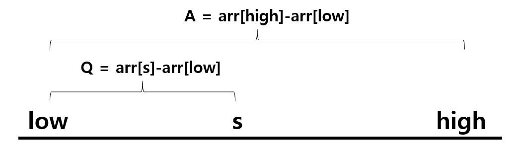 따라서, 어떤 arr의 가장 작은 인덱스를 low, 가장 큰 인덱스를 high라고 할 때, 찾고자 하는 데이터의 인덱스 값 s는 위와 같이 비율 관계를 이용하여 계한할 수 있다. 이를 코드로 옮겨 보다.