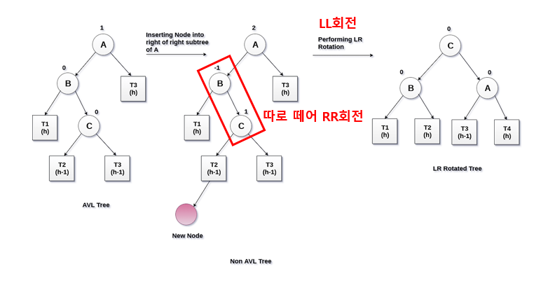 - LR 상태: 자식 노드가 왼쪽->오른쪽으로 연속하여 연결된 경우 - LR 회전으로 rebalancing